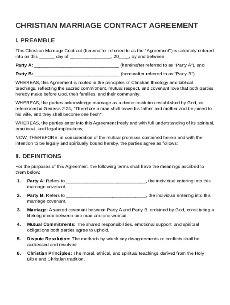 This document is a formal agreement that outlines the commitments, responsibilities, and expectations of the parties entering into a Christian marriage, including legal, spiritual, and emotional elements.