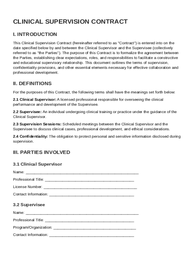 A Clinical Supervision Contract is a tool that formalizes the relationship between a clinical supervisor and a supervisee. This contract is crucial for defining roles, responsibilities, and the expectations of both parties involved. By formalizing these aspects, the contract minimizes misunderstandings and ensures that both parties are aware of their obligations.