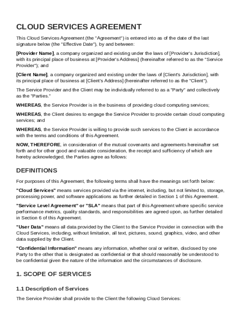 Filling out a Cloud Contract Template form requires careful attention to detail to ensure clarity and compliance. First, gather necessary information such as your Service Provider's name, the jurisdiction applicable to the contract, and the address. Additionally, using tools like pdfFiller can streamline the process, making it easier to fill in and edit as needed.