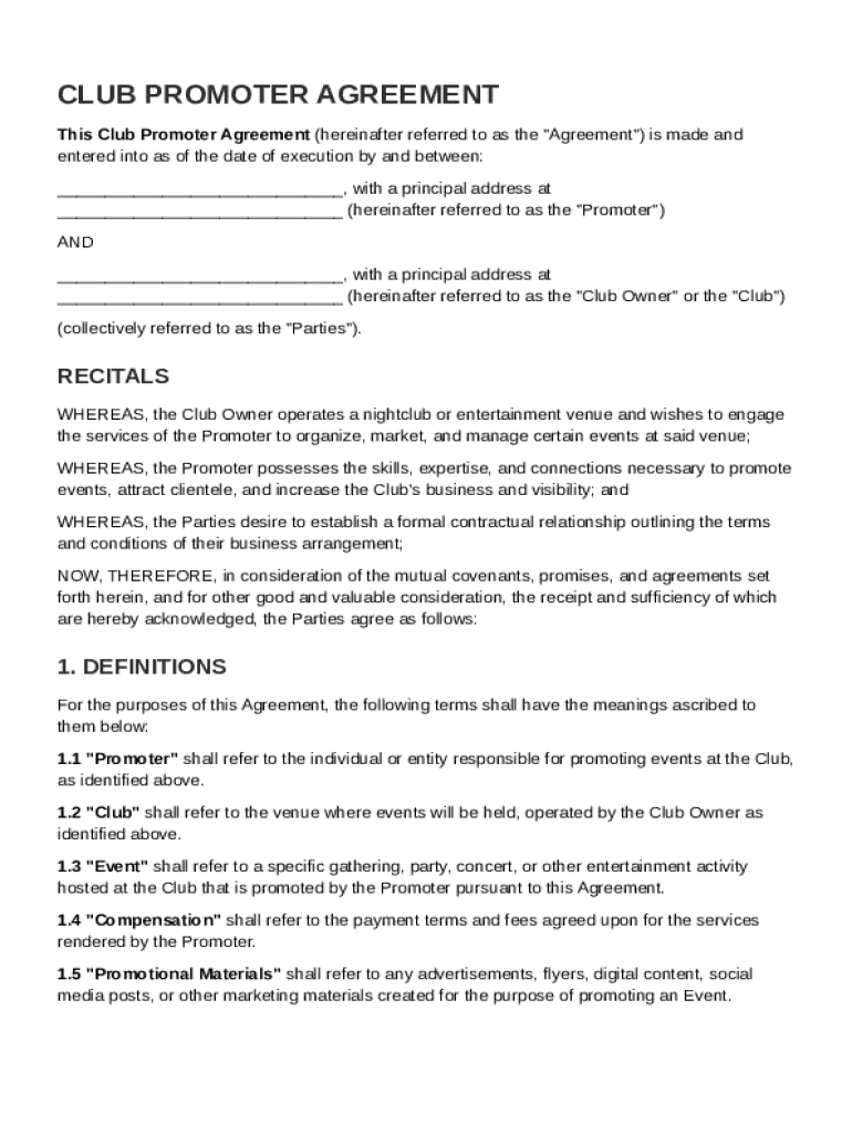 A Club Promoter Contract Template is a legal document outlining the terms and conditions of the relationship between a club promoter and a venue or event organizer.