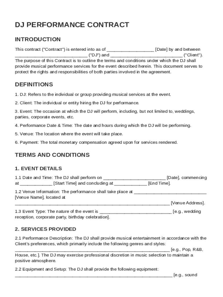 A DJ Performance Contract establishes expectations and responsibilities for both the DJ and the client. This contract not only protects both parties legally but also clarifies service provisions and terms, making it vital for successful events.