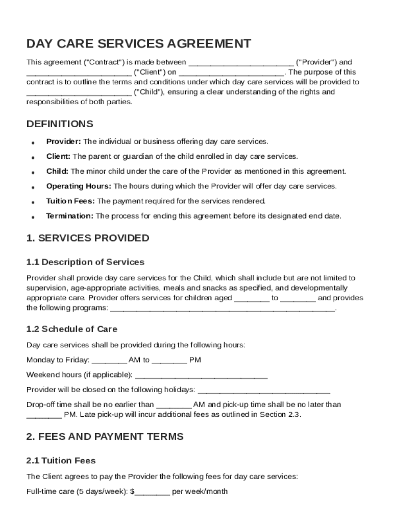 This agreement outlines the terms and conditions for providing day care services, detailing the rights and responsibilities of the Provider and Client.