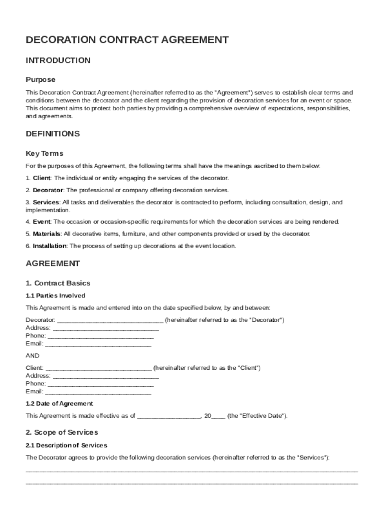 A Decoration Contract Template is a formal agreement outlining the terms and conditions for decoration services between a decorator and a client.