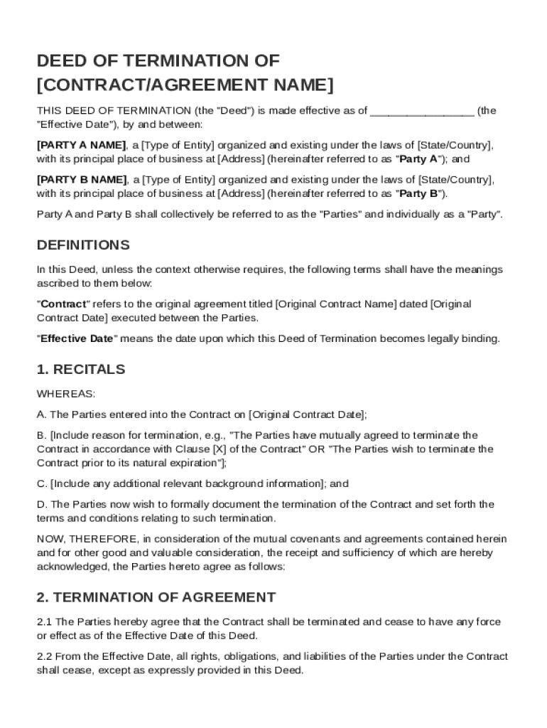 The Deed Of Termination Contract Template serves as a critical document to officially end a contractual relationship. Understanding its components and how to accurately complete the form is essential for all parties involved. This guide provides detailed insights on how to effectively utilize this template.