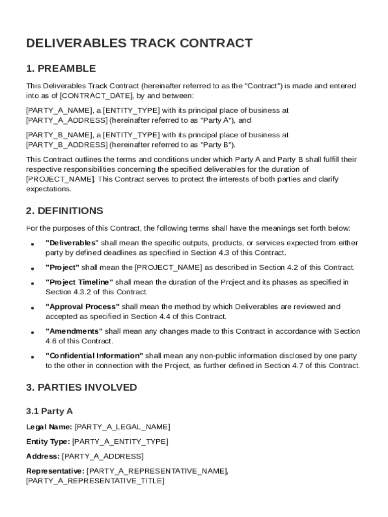 The Deliverables Track Contract Template is a formal document used to outline and manage the specific outputs and performance expectations in a contractual agreement.