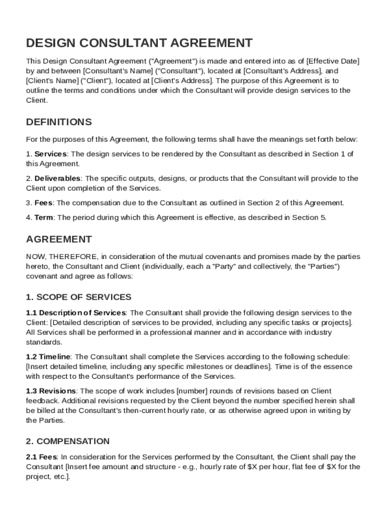 A Design Consultant Contract Template is a formal agreement outlining the terms and conditions between a design consultant and a client for design services.