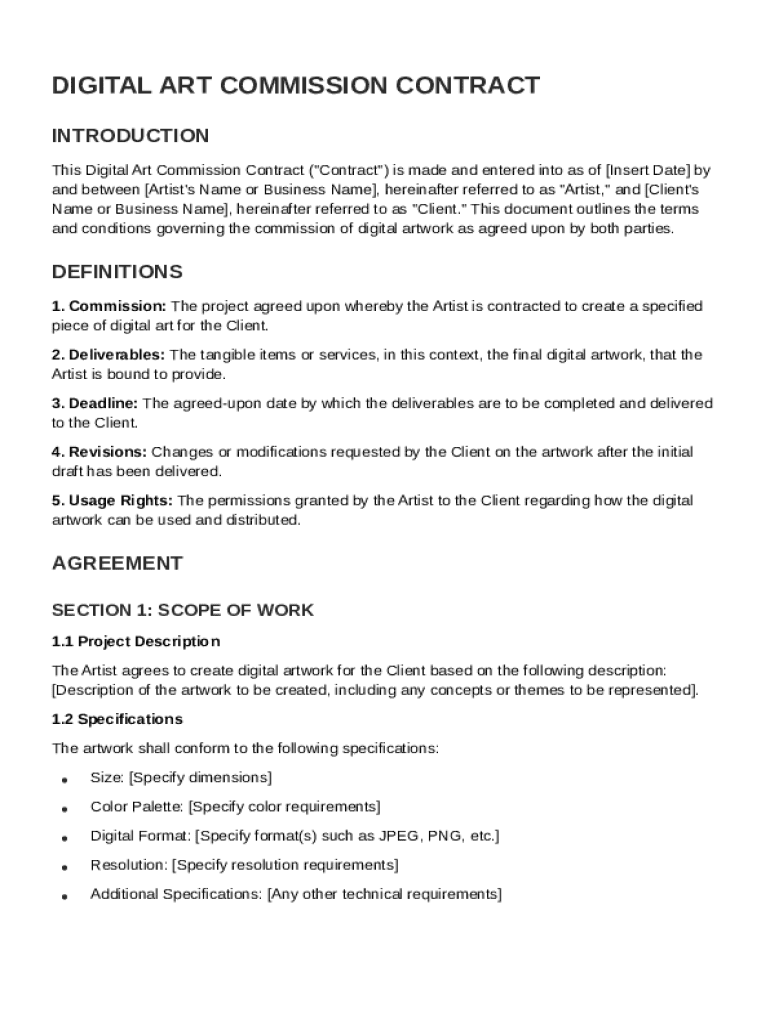 This document outlines the terms and conditions governing the commission of digital artwork between the Artist and Client.