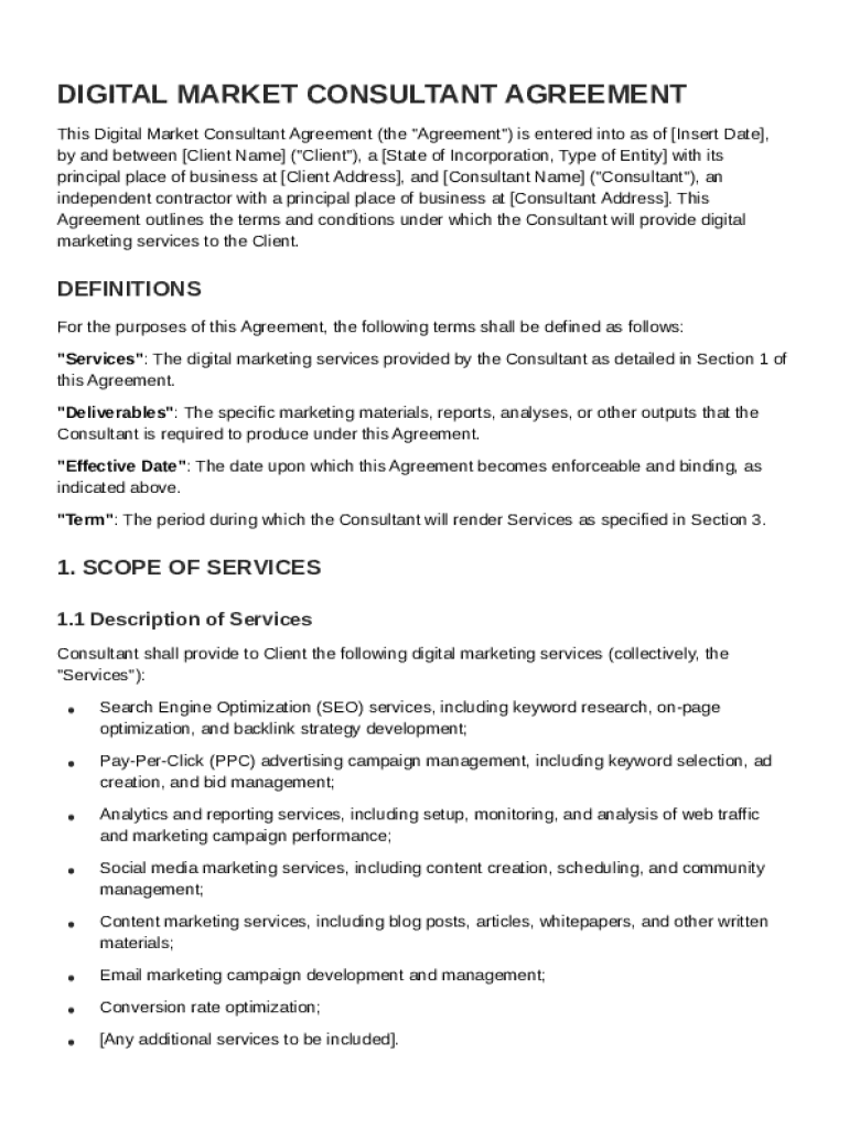 A Digital Market Consultant Contract Template is designed to formalize the relationship between a client and a digital marketing consultant. This document outlines the expectations, services, and legal obligations of both parties. A well-crafted agreement can help prevent misunderstandings and provide a roadmap for engagement.