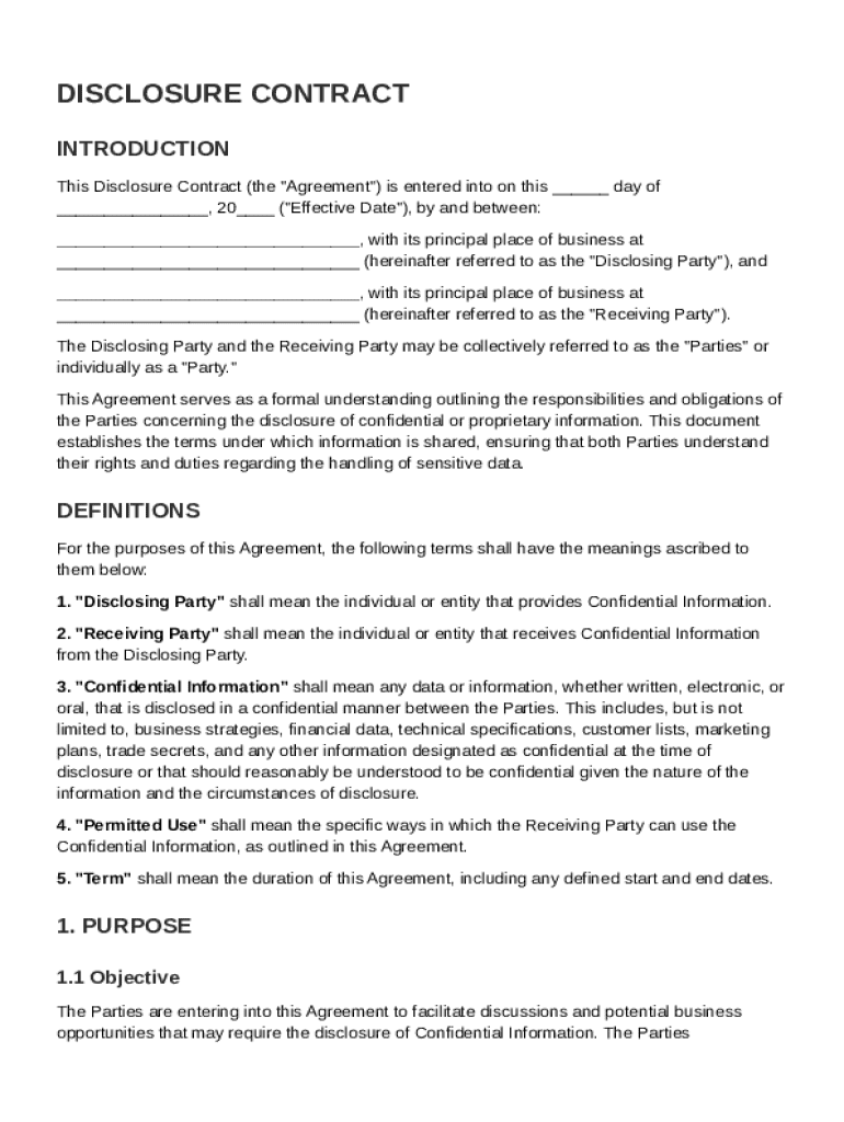 Preview of a standard Disclosure Contract template that can be tailored to specific needs.