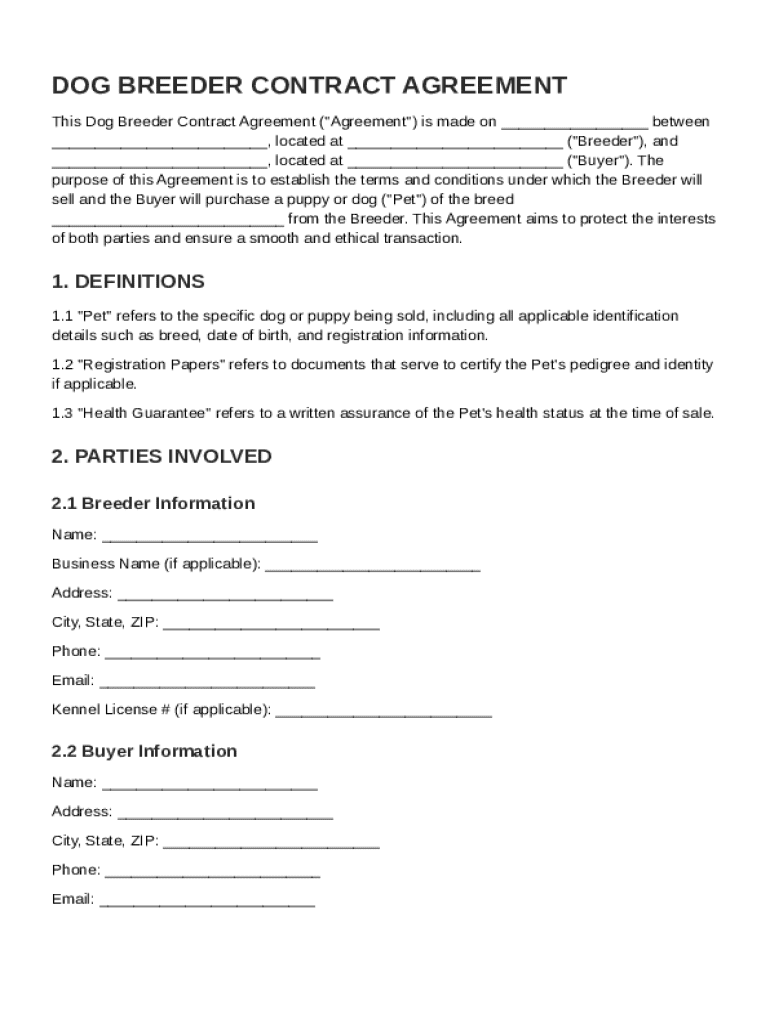 A Dog Breeder Contract Template is a legally binding document that outlines the terms and conditions agreed upon by the dog breeder and the buyer. It aims to ensure accountability and transparency in the breeding and purchasing process.