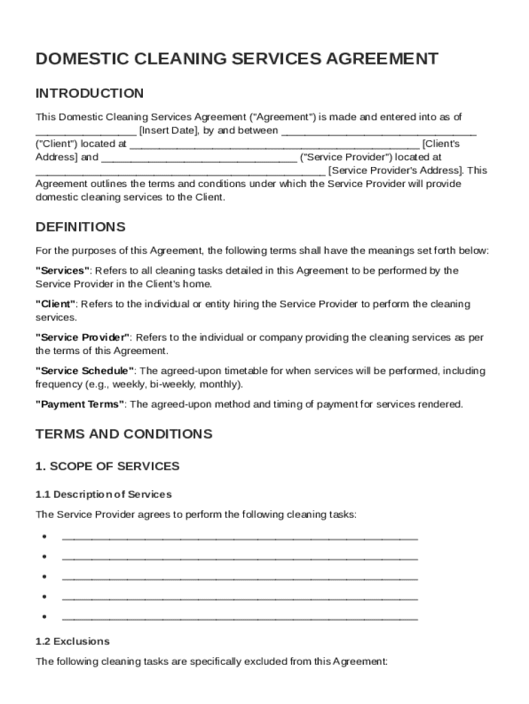 This Agreement outlines the terms and conditions under which a Service Provider will provide domestic cleaning services to a Client, including definitions, responsibilities, payment terms, and dispute