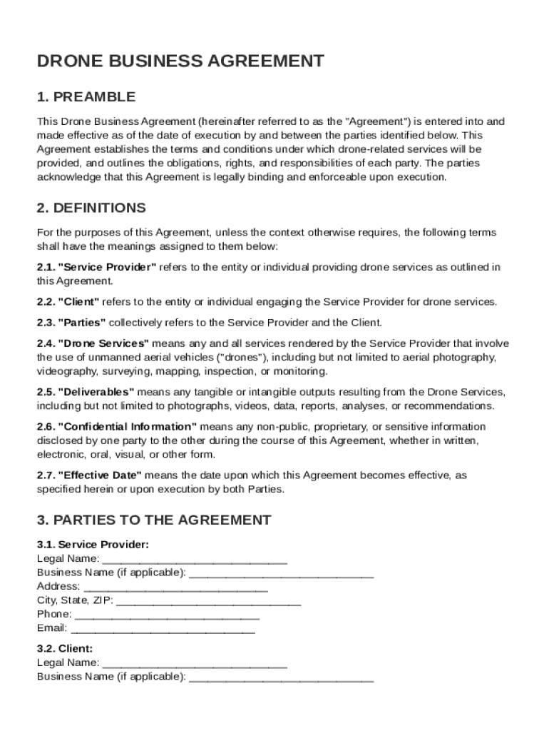 A drone business agreement is a legally binding document that outlines the terms and conditions between a service provider and their clients regarding the use of drone services. The importance of a legally binding document in drone services cannot be overstated; it protects both parties by detailing expectations, deliverables, and financial arrangements.