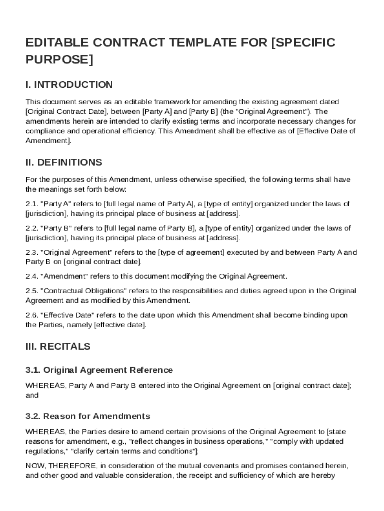 An Edit Contract Template is a standardized document used to make modifications to an existing contract efficiently.
