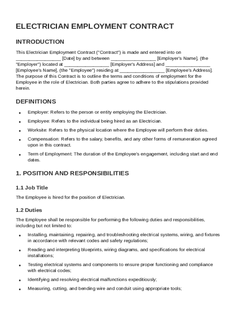 This contract outlines the terms and conditions of employment for an Electrician, including job responsibilities, compensation, benefits, and termination procedures.