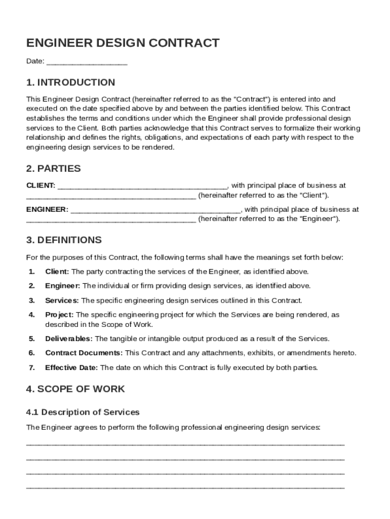An Engineer Design Contract is a formal agreement specifying the responsibilities of an engineer and a client for engineering services. The contract outlines expectations, deliverables, and terms of compensation, ensuring that both parties have a clear understanding of their roles and responsibilities.