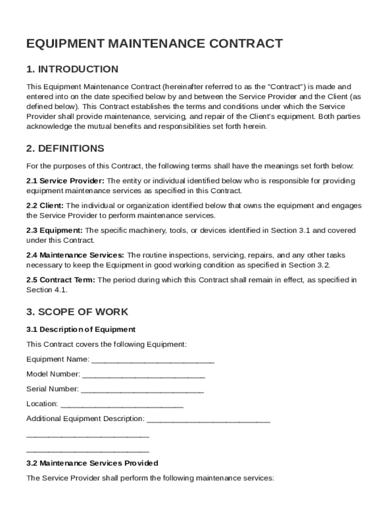 Definition and key provisions of a Equipment Maintenance Contract Template