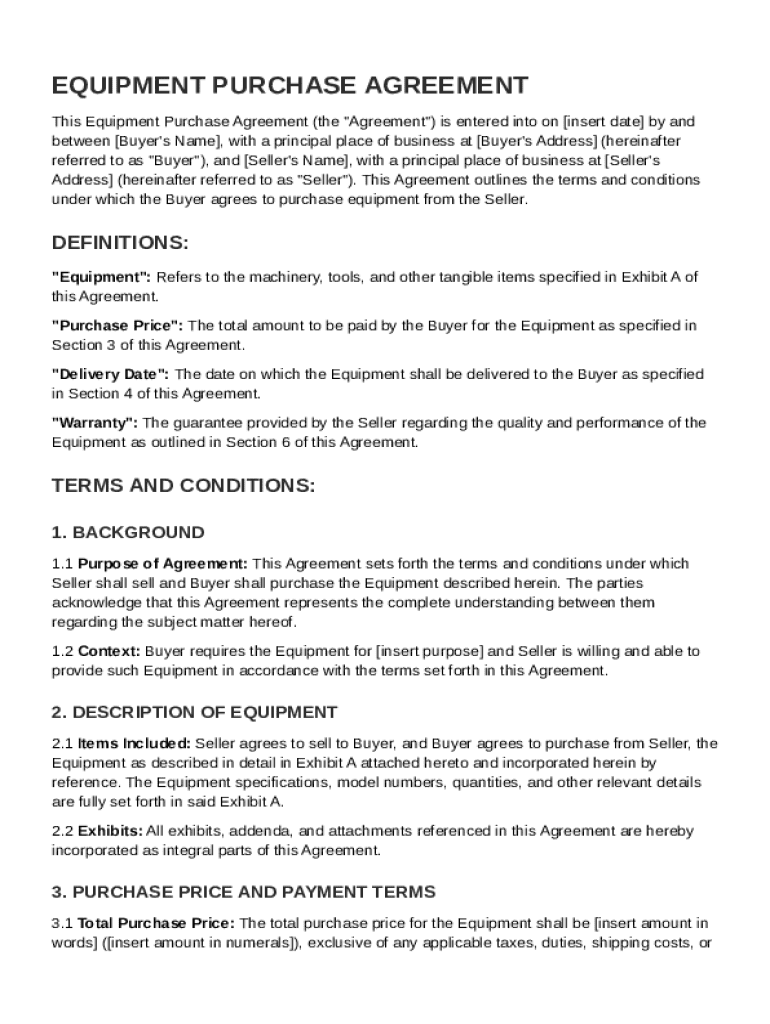This document outlines the terms and conditions under which a Buyer agrees to purchase equipment from a Seller, detailing definitions, purchase price, delivery, inspection, warranty, and other legal