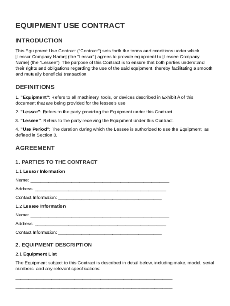 Equipment use contracts are legally enforceable agreements between a lessor (the owner) and a lessee (the renter) for the use of equipment. These contracts are essential as they outline the responsibilities of each party, helping to avoid disputes. Without a contract, issues such as equipment damage or loss become riskier and potentially more costly.