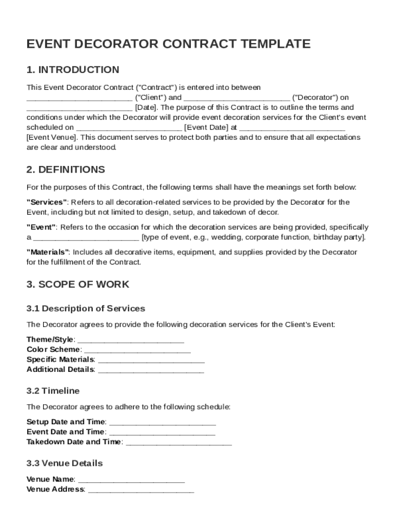 An Event Decorator Contract Template is a formal agreement used to outline the details and responsibilities of event decoration services provided by a decorator.