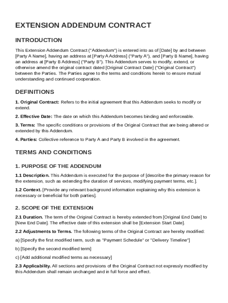 An Extension Addendum Contract Template is a legal document used to extend the duration of a contract or agreement between parties.