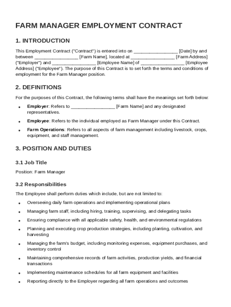 A Farm Manager Employment Contract is a critical document that establishes the legal relationship between an employer and a farm manager. This contract lays out the expectations, responsibilities, and rights of both parties, defining the parameters for the employment relationship. Understanding this document is fundamental for ensuring compliance with labor laws and facilitating smooth operations on a farm.