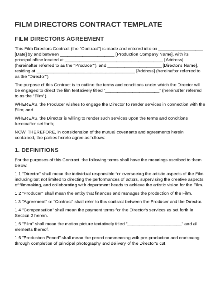 A Film Directors Contract is a formal agreement that outlines the expectations, responsibilities, and financial arrangements between a director and a producer. This contract is crucial for protecting the rights and interests of all parties involved in the filmmaking process. The legal implications of not having a formal agreement can lead to disputes or misunderstandings.