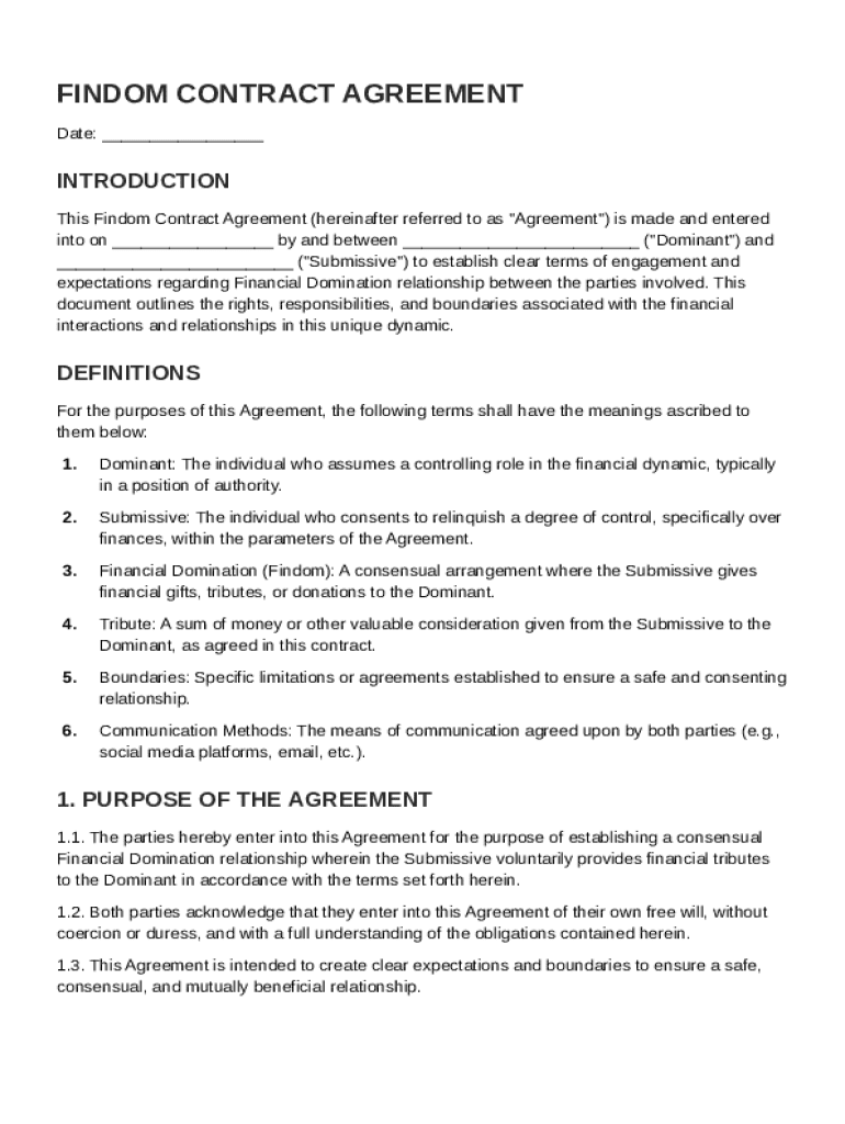A Findom Contract Template is a formal agreement between parties where one individual (the submissive) agrees to financially serve another (the Dominant) within a defined relationship structure. This legally binding document outlines the expectations, boundaries, and consent of both parties involved.