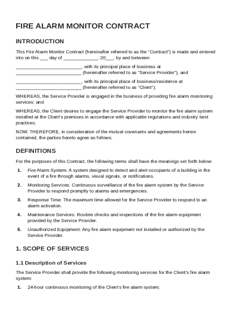 A Fire Alarm Monitor Contract serves as a formal agreement between a service provider and a client for monitoring fire alarm systems. It outlines the responsibilities and expectations of both parties, ensuring compliance with safety standards and regulations. Having a well-defined monitoring agreement is crucial for maintaining safety, reducing liability, and ensuring rapid response in emergencies.