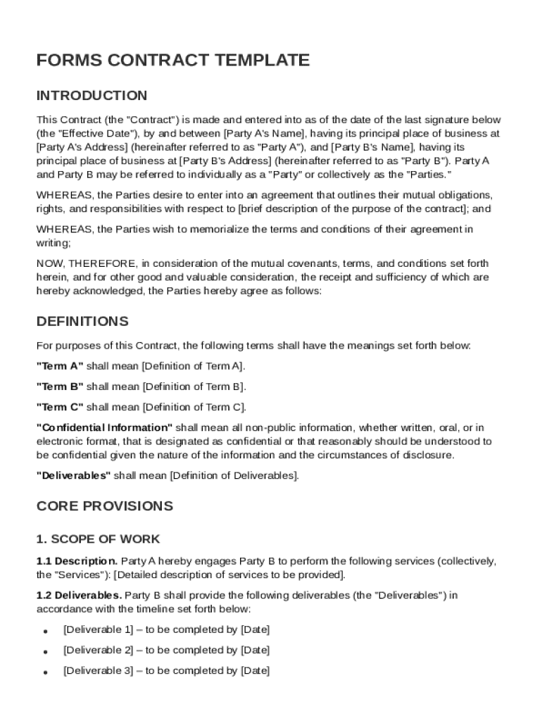 A Forms Contract Template is a standardized document used to outline agreements and terms between parties in a clear and legally binding manner.