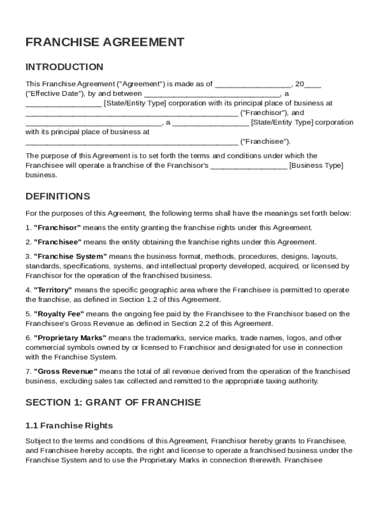 A Franchise Agreement is a legally binding contract between a franchisor—a company granting the rights to use its brand—and a franchisee, an individual or group receiving the rights. This agreement outlines the roles, responsibilities, and expectations each party has in the business relationship. A well-structured Franchise Agreement helps protect both parties and sets the tone for a successful franchise operation.