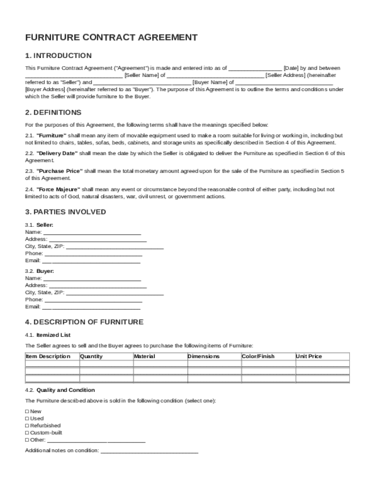 A Furniture Contract Template is a legal document outlining the terms and conditions for buying or selling furniture.