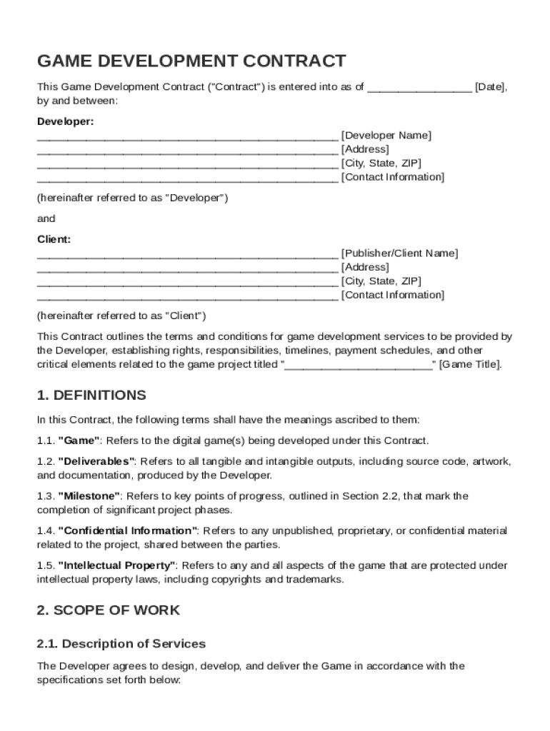 A game development contract is a legally binding document between a game developer and a client, outlining the terms of the project. This includes the project's scope, deliverables, timelines, and payment terms. Having a formal contract is crucial for protecting both parties and ensuring that expectations are clearly defined.