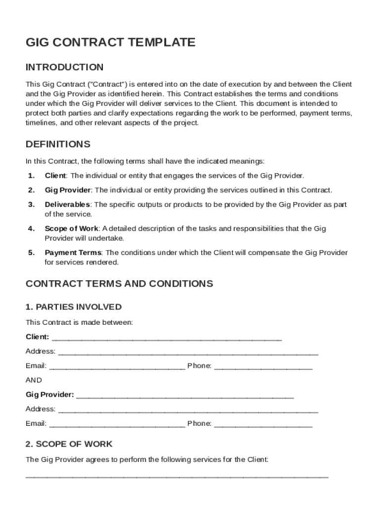 A Gig Contract Template is a pre-formatted document that outlines the terms and conditions between a freelancer and a client for a specific project.