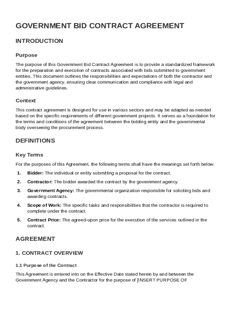 This document provides a standardized framework for preparing and executing contracts associated with bids submitted to government entities, outlining responsibilities and expectations of both the