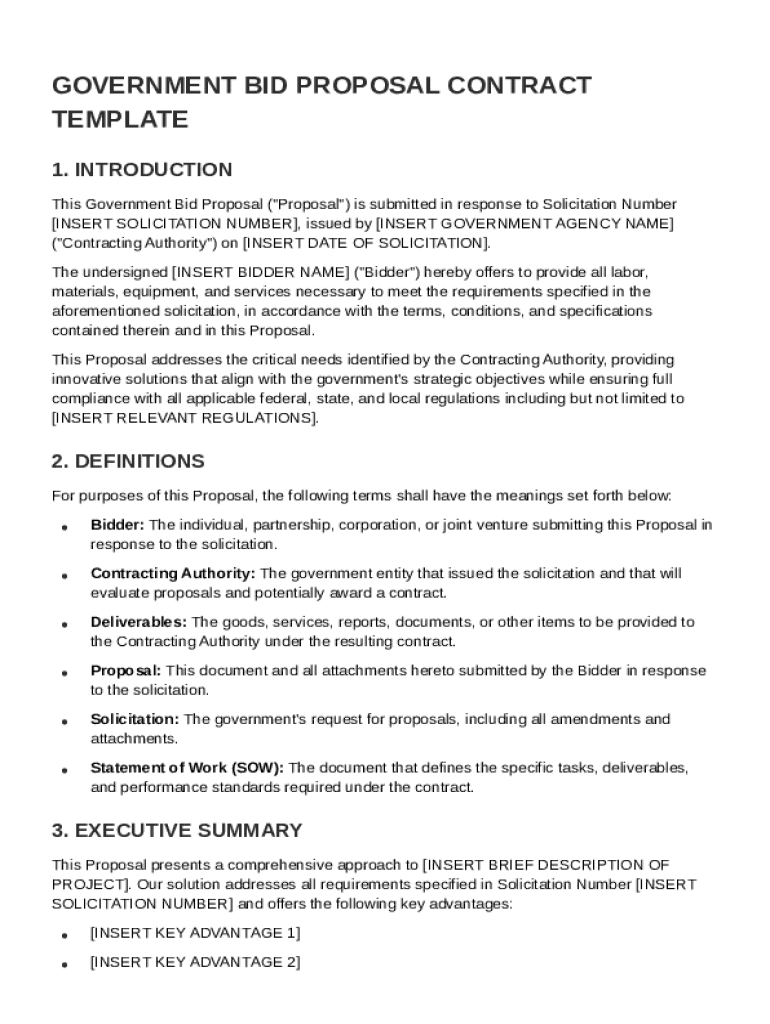 A government bid proposal is a formal document submitted in response to a solicitation by a government agency. Its primary purpose is to present a well-structured offer that meets the agency's needs while complying with relevant regulations. Understanding the importance of compliance with federal, state, and local guidelines is crucial for a successful bid.