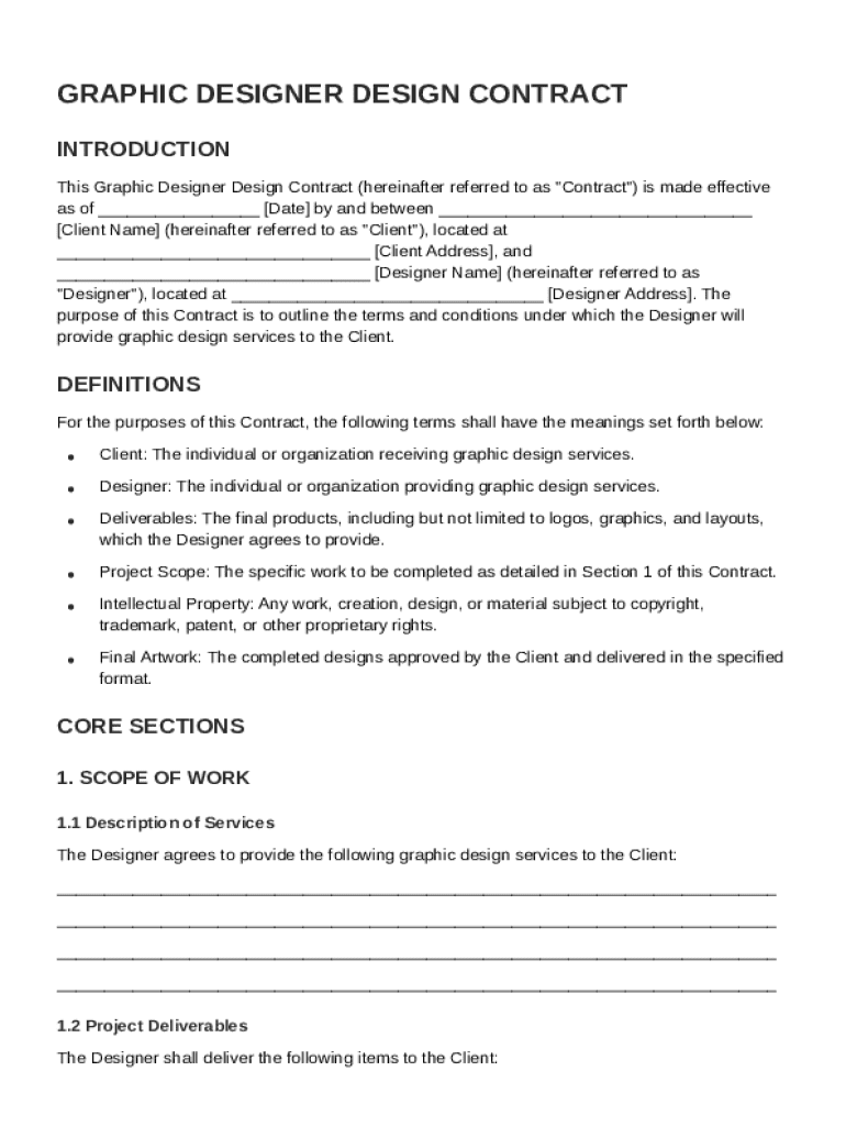 This contract outlines the terms and conditions for graphic design services provided by a designer to a client.
