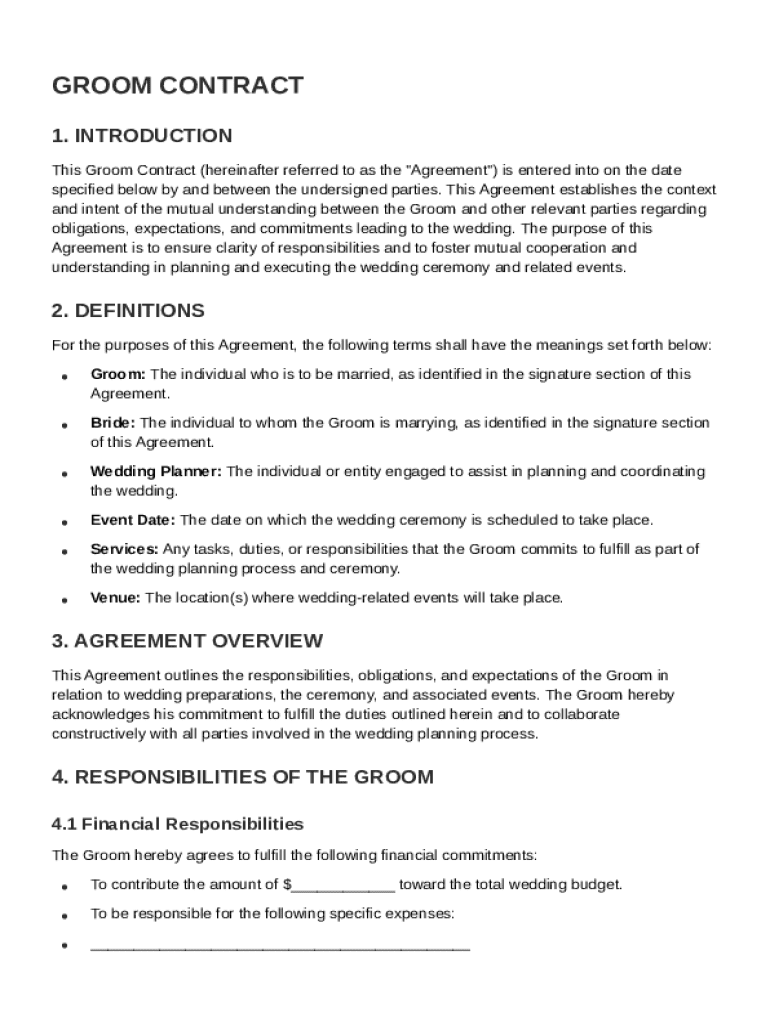 This document serves as a contract between the Groom and other relevant parties to outline responsibilities, obligations, and expectations related to wedding planning and execution.