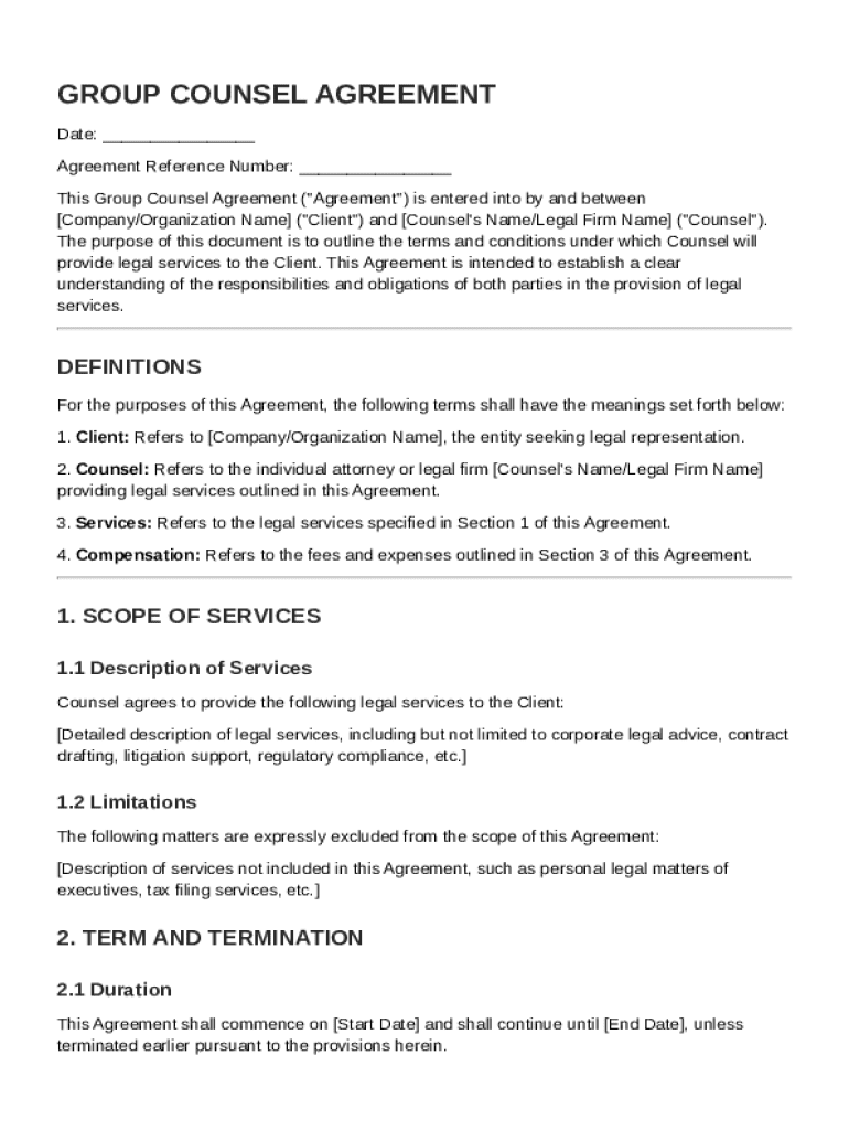 Outlining the services provided within the Group Counsel Agreement is fundamental. A well-defined scope can prevent disputes and misunderstandings down the line.