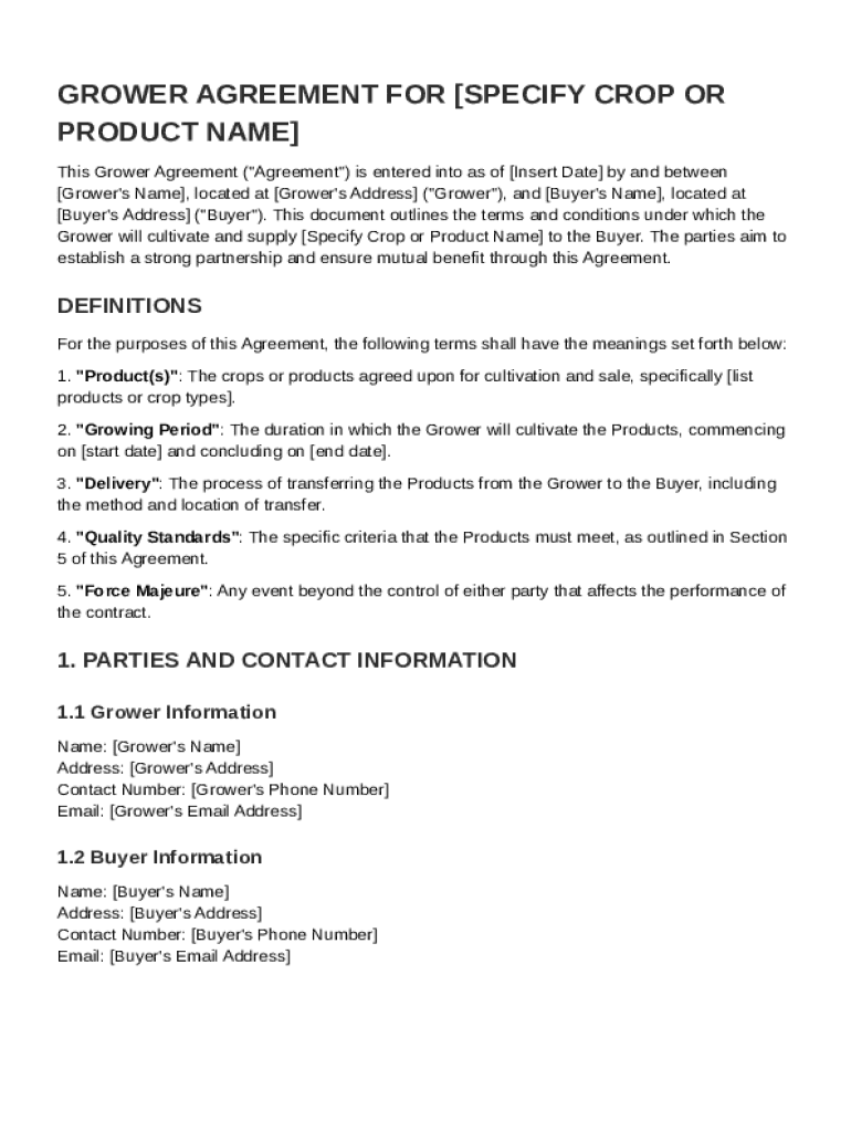 This document outlines the terms and conditions under which a Grower will cultivate and supply specified crops or products to a Buyer, aiming to establish a partnership between the parties.