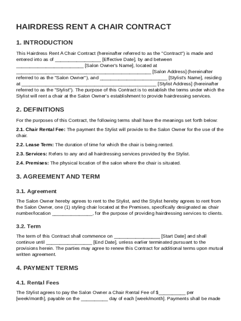 Understanding the terminologies used in the Hairdress Rent A Chair Contract is essential to both parties for effective communication and contract management. Definitions such as 'chair rental fee' and 'services' should be unambiguous to prevent disputes regarding compliance and responsibilities.