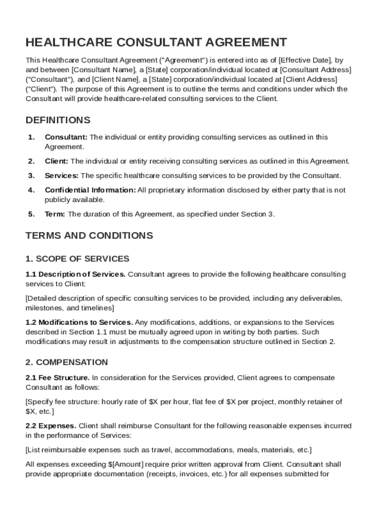 A Healthcare Consultant Contract Template is essential for ensuring that both consultants and clients understand their roles, responsibilities, and the scope of services provided. This guide offers an in-depth look at effectively drafting and utilizing such agreements.