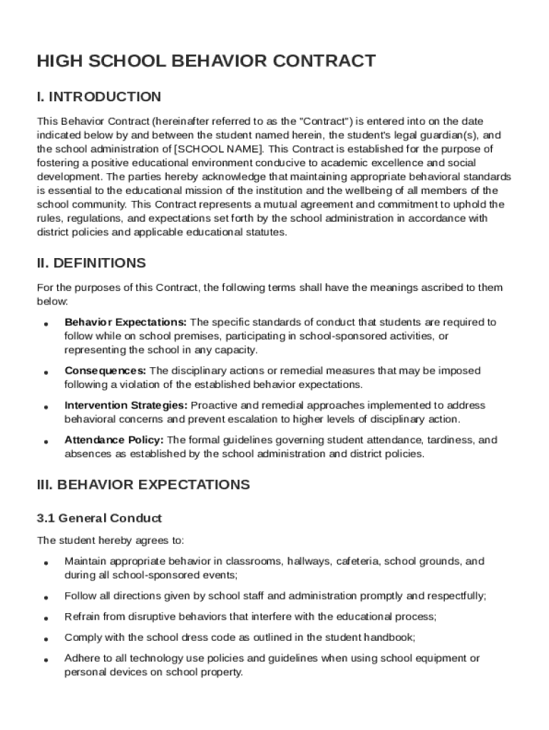 The High School Behavior Contract Template is a formal agreement outlining expected behaviors and consequences for students in a high school setting.