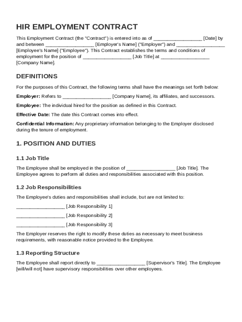 The HIR Employment Contract serves as a formal agreement between an employer and employee. Its purpose is to define the terms of employment, including responsibilities, compensation, and legal rights. Establishing clear terms through this contract is crucial to prevent misunderstandings and ensure a smooth working relationship.