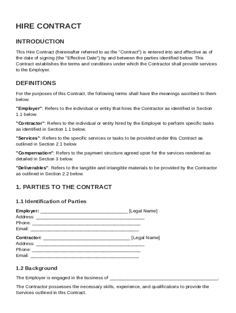 A hire contract is a legally binding document that outlines the terms of an agreement between a contractor and an employer. Understanding the nature of these contracts is essential for both parties, as they dictate responsibilities, compensation, and expectations.