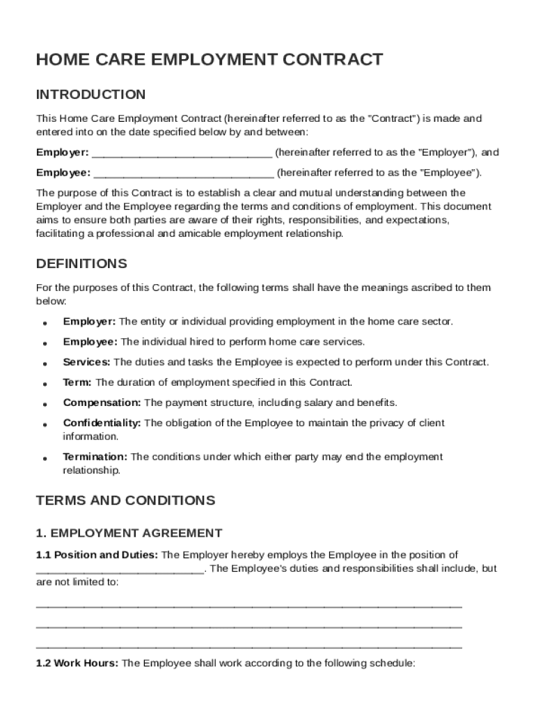 The Home Care Employment Contract Template is a legal document that outlines the terms and conditions of employment for caregivers in a home care setting.