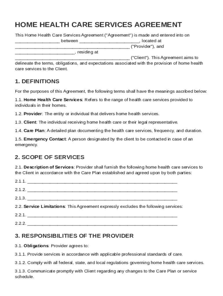 This document outlines the terms, obligations, and expectations regarding the provision of home health care services between the Provider and the Client.