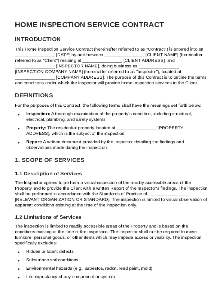 A home inspection service contract is a legal document that outlines the terms of the inspection process between a client and an inspector. Its importance lies in protecting the rights and responsibilities of both parties involved.