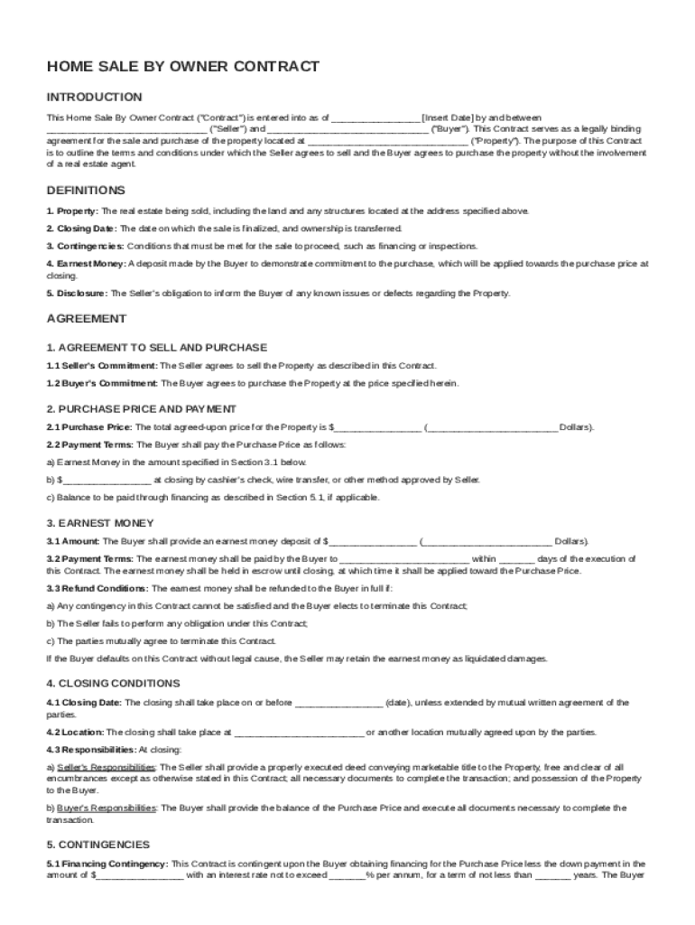 The Home Sale By Owner (FSBO) Contract outlines the terms of sale between the seller and buyer. Understanding this contract is vital as it legally protects both parties and delineates responsibilities and expectations throughout the sale process.