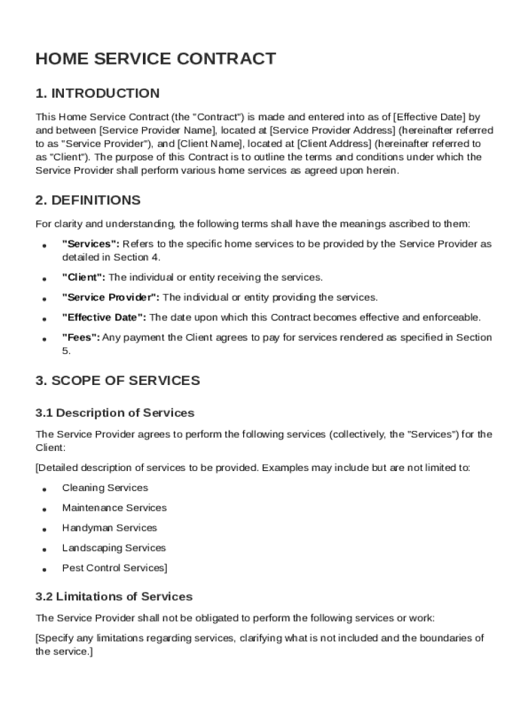 Home service contracts outline service expectations, duration, payment terms, and liabilities.