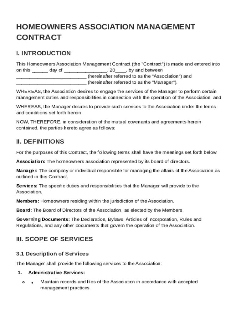 A Homeowners Association Management Contract Template is a formal document outlining the agreement between a homeowners association and a management company regarding the responsibilities and services to be provided.